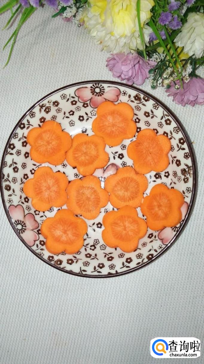 将五花肉洗净后切碎,再用模具将胡萝卜刻出几个小花,我们用胡萝卜小花来做珍珠丸子的底座,