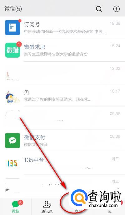 打开微信,然后再点击右下角的“发现”选项卡。