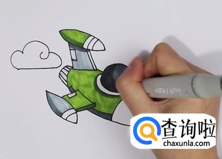 开始涂色啦,我们先给机身涂上绿色,机翼和尾翼的部分涂上灰色,机身部分涂深灰色。