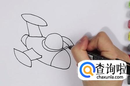 首先画出战斗机的机身,两头较尖,中间圆润,在两边画上机翼,后面画上尾翼。