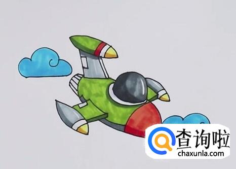 继续给战斗机的机头涂红色,机翼尖部涂黄色,云朵涂上蓝色,帅气的战斗机简笔画就完成啦!
