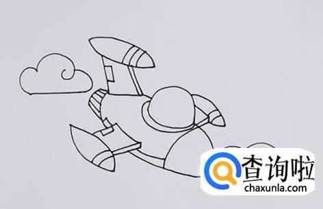 补充战斗机的细节,画上机翼和机尾上的纹理,并在战斗机前后画上云朵。