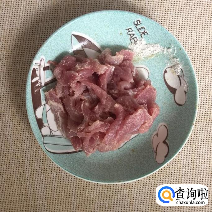 然后将瘦肉切成薄片并用适量的地瓜粉裹一下。