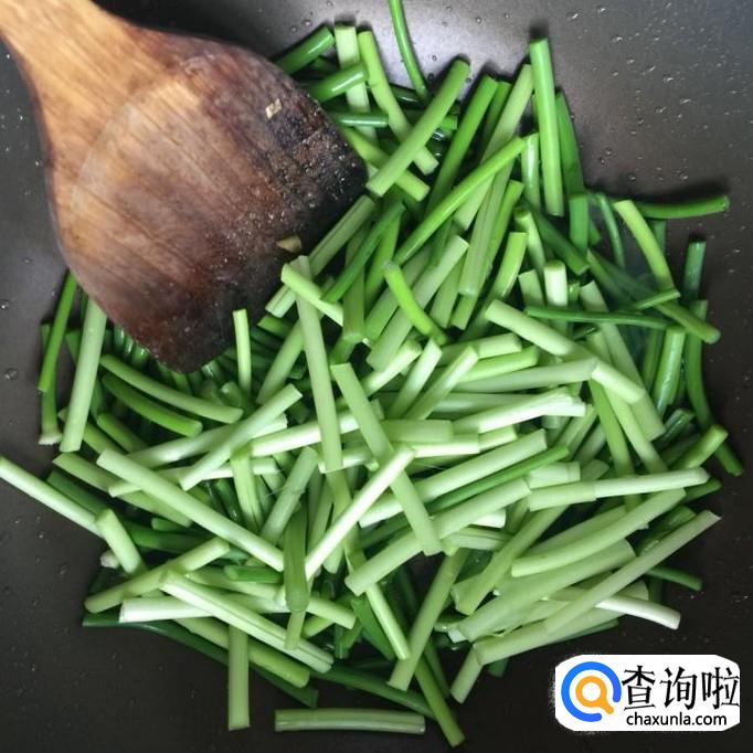 然后把蒜薹切成长约三厘米的段,将底油加热至冒烟,倒入蒜薹,翻炒五分钟。
