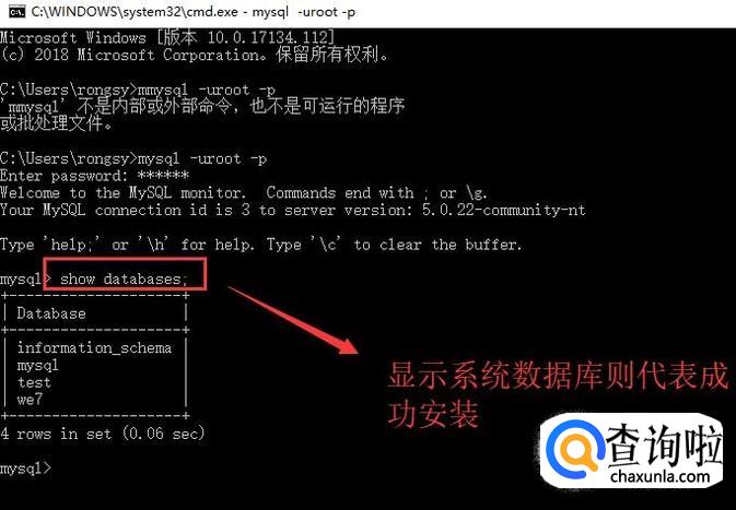 我们在mysql命令模式下面输入show databases命令,如果显示了如下图所示的数据库信息则证明了mysql安装成功了