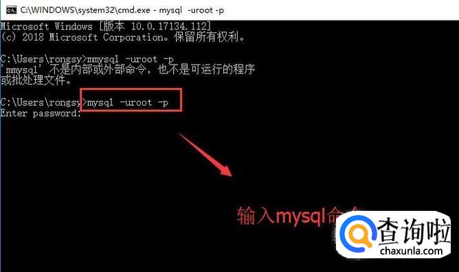 在打开的CMD命令行中我们输入mysql命令,注意-u代表的是登录用户,-p代表的是登录密码,如下图所示