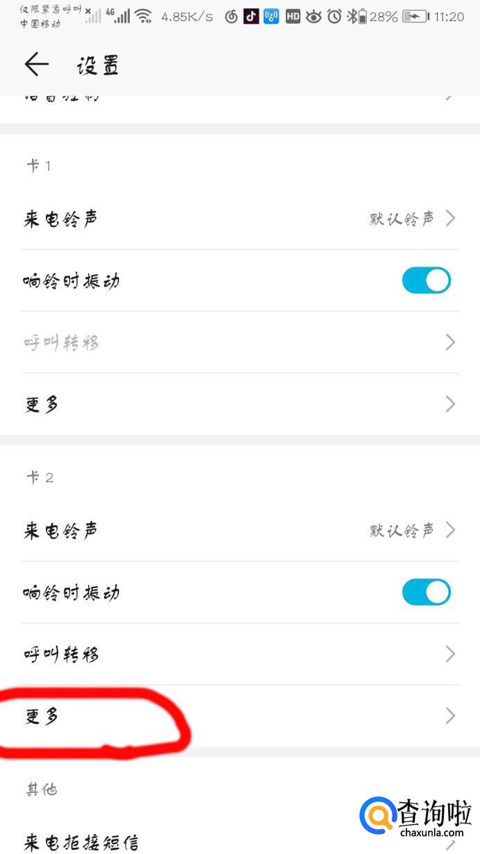 两张手机卡,我是主用卡2,所以点击卡2下面的“更多”。
