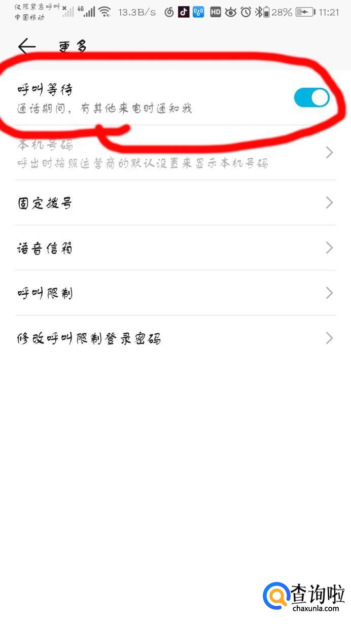 在此界面的“呼叫等待”右边滑块打开即可,这样问题就解决了。