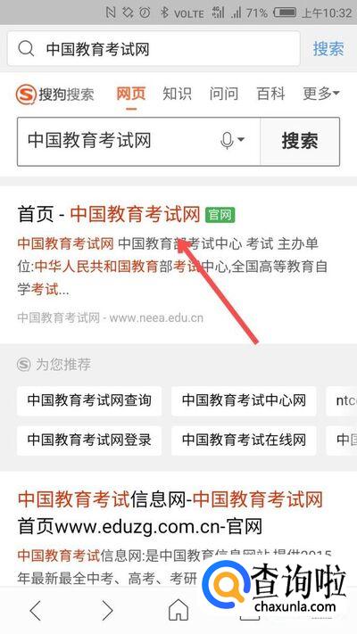 打开搜狗浏览器,搜索“中国教育考试网”,选择第一项进入。