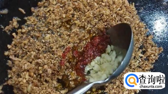 等猪肉糜炒出猪油后,向锅中加入5g郫县豆瓣酱和10g蒜末。