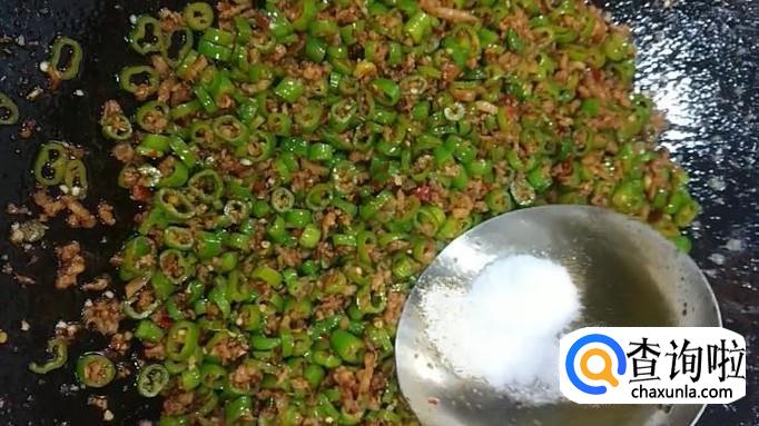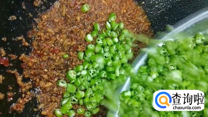 将准备好的朝天椒丁放入锅中,小火翻炒均匀。