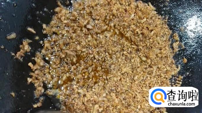 在炒锅中加入少许植物油,油热后将150g猪肉糜倒入锅中,小火翻炒直至变色。