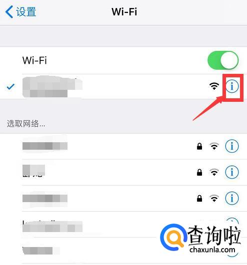 除此之外,你还可以打开手机设置,点击“Wi-Fi”,点击当前连接的网络右侧的感叹号图标。