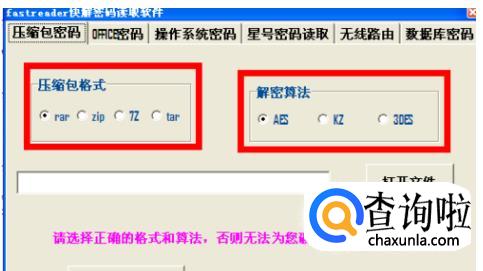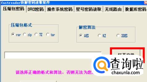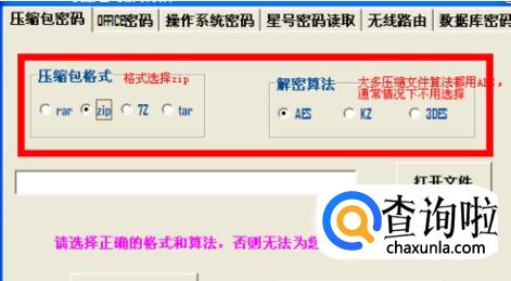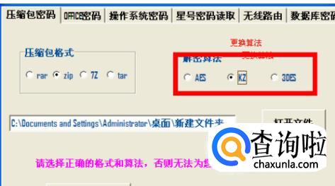 4、压缩包格式选择对应的格式,现在我破解的是“rar”格式的,所以选用“rar”,算法默认选择“AES”即可,不做处理即可,如果破解失败,则是算法不正确,由于不同压缩软件和压缩格式使用的算法不相同,我们依次换算法破解即可,破解算法肯定是3种算法中的一种。