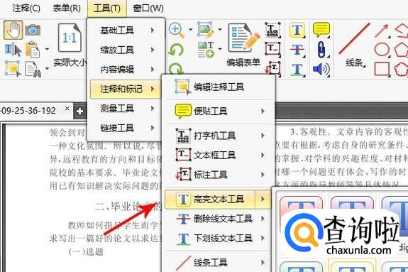 选择菜单栏里的工具,点击注释和标记,注释和标记听名字就知道是用来注释文本和标记文本的,选择高亮文本工具。
