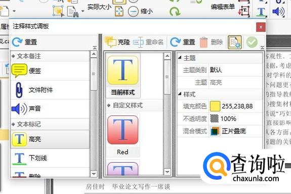 点击注释样式调板,在这里可以自定义主题,如果不喜欢的话,还可以自己设置填充颜色,不透明度,混合模式。