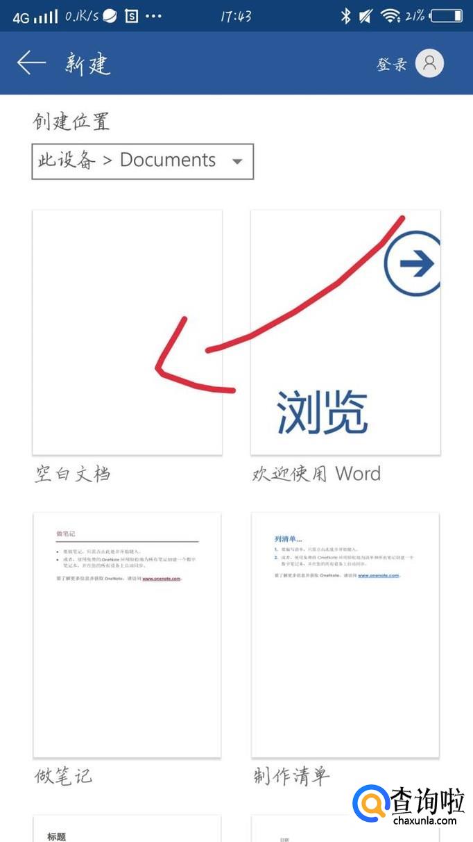 点击“空白文档”选项,如图1箭头所示。你会看到出现一个新的界面,如图2所示。