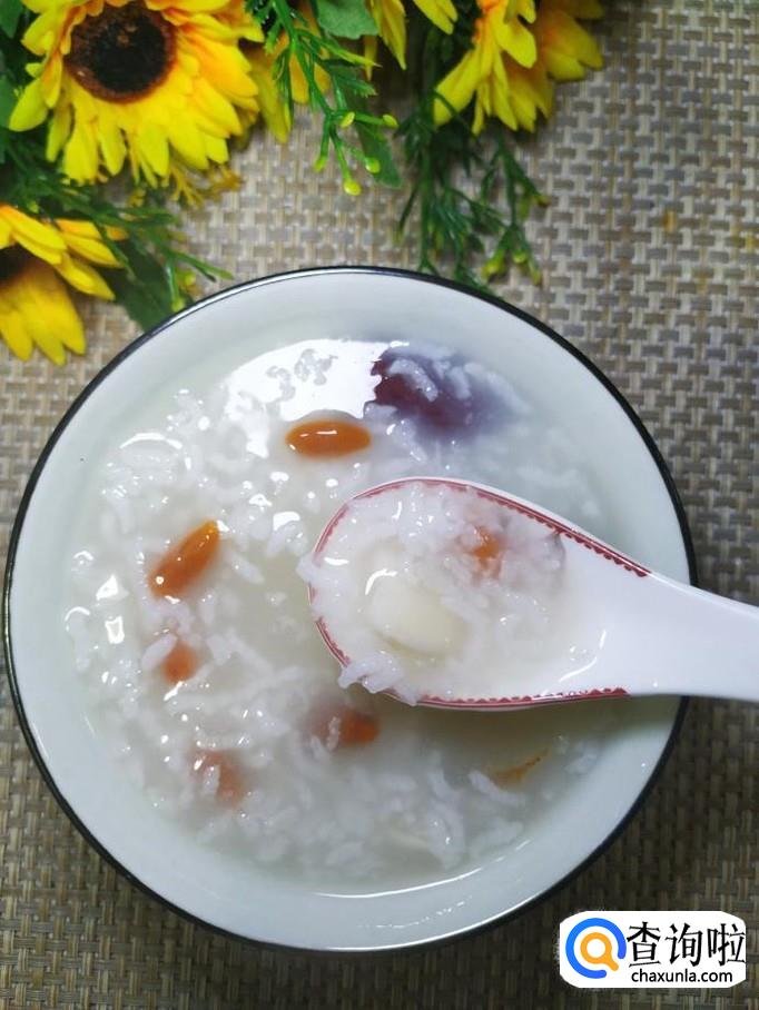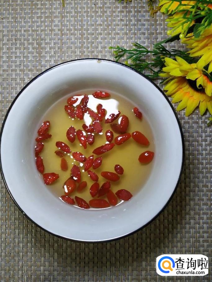 碗中放入枸杞子,用清水泡开,洗净后,将枸杞子也倒入锅中。