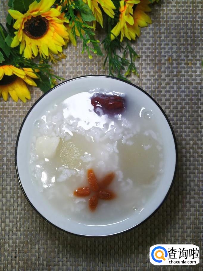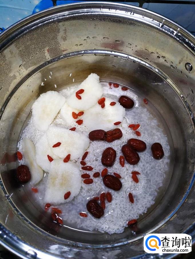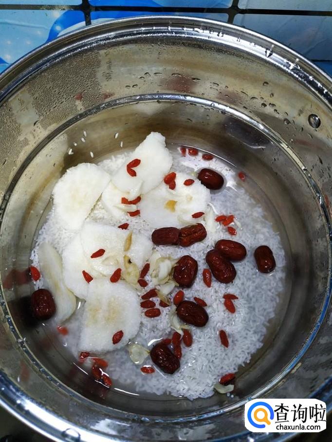 雪梨适量,大米适量,枸杞子适量,红枣适量,冰糖适量,百合适量。