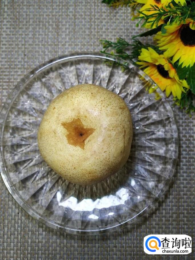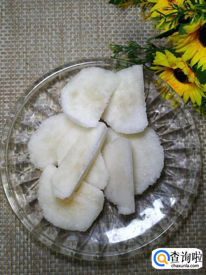 准备一个雪梨,洗净后,切成大块儿,倒入锅中。