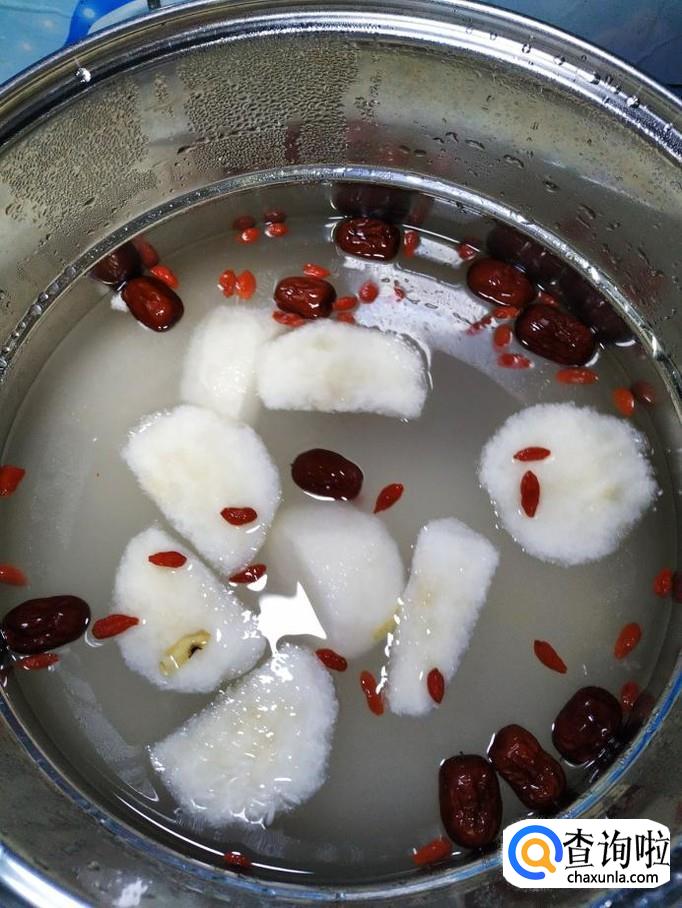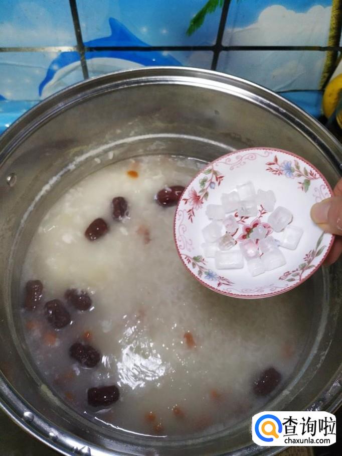 加入适量清水,盖上锅盖,大火将水烧开,水开后转小火,煮30分钟,然后加入适量冰糖。