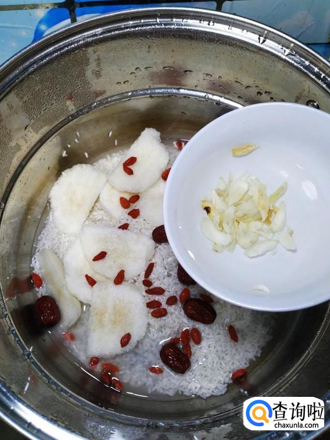 准备适量干百合,用清水泡开,然后将百合也倒入锅中。