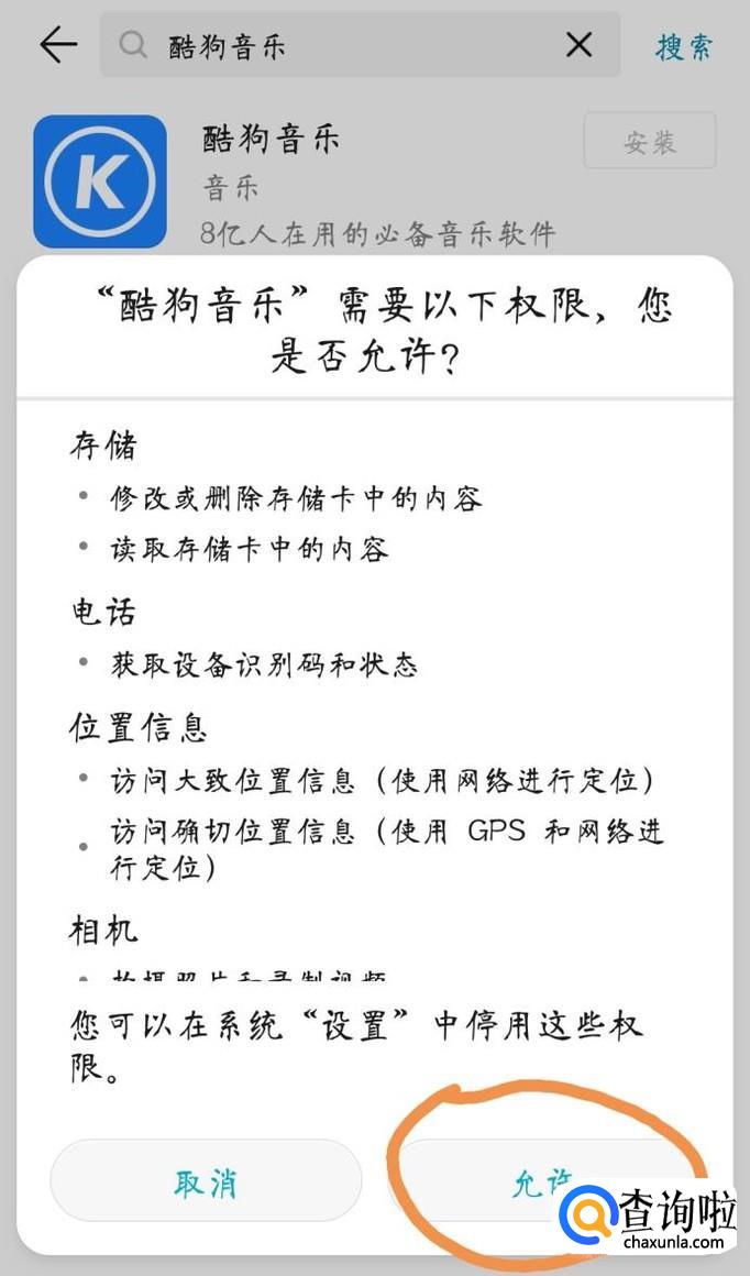 最后,点击最下面的“允许”选项即可完成酷狗音乐的下载