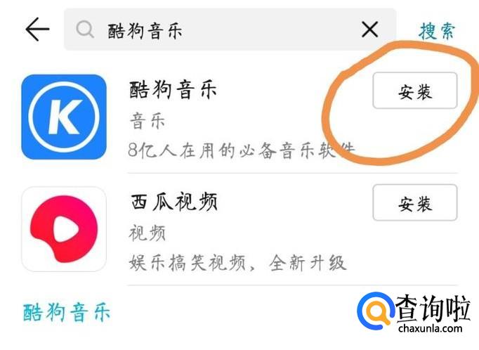 在搜索栏中输入“酷狗音乐”,点击搜索。在出现的搜索结果中选择酷狗音乐,点击下载