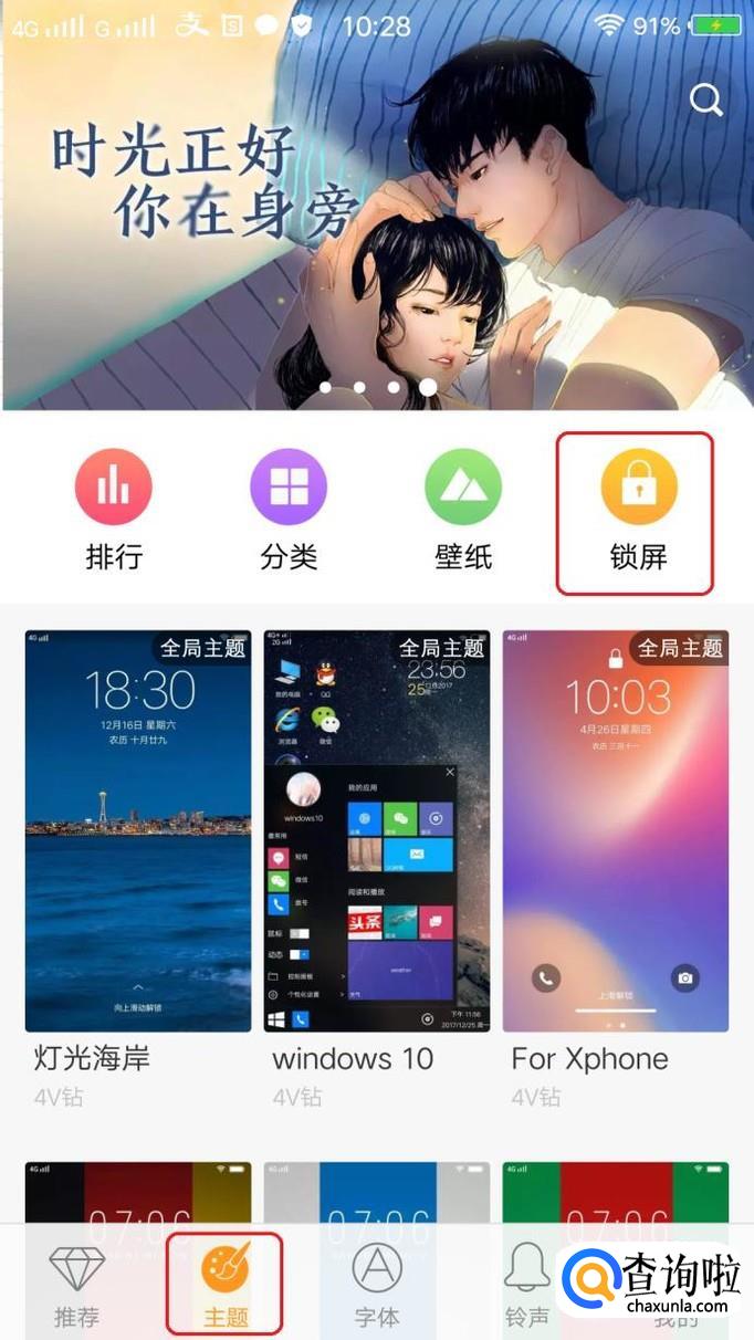 点击底部“主题”标签,然后点击一下页面内的“锁屏”按钮。