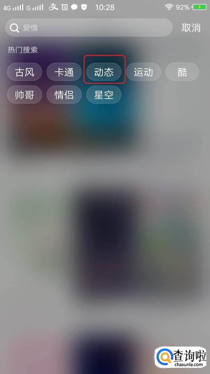 进入之后,点击查找按钮,不需输入内容,就能看见下方“热门搜索”里面有“动态”选项,我们点击一下“动态”。