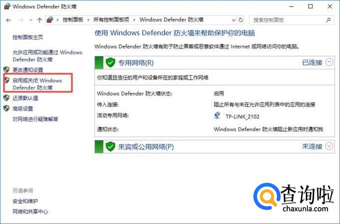 弹出的界面,我们点击启用或关闭Windows Defender防火墙;