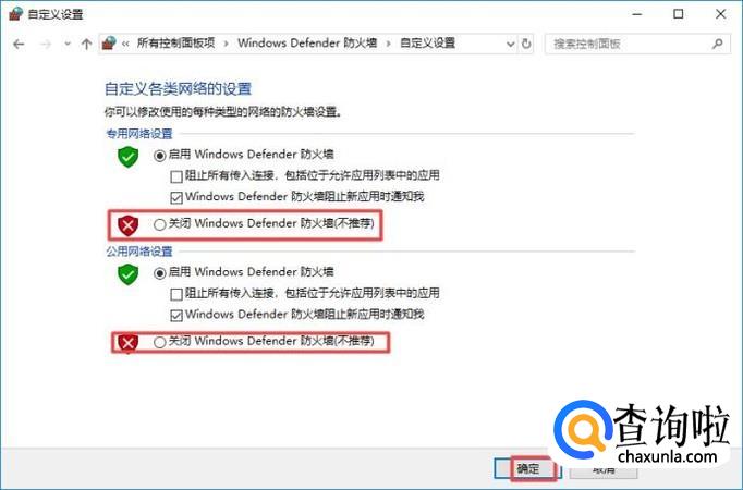 关闭的话,我们点击专用网络设置和公用网络设置中关闭Windows Defender防火墙就可以了。