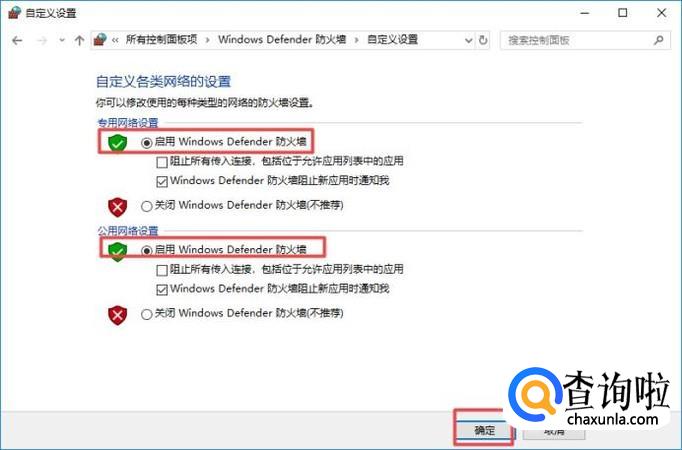 弹出的界面,我们将专用网络设置和公用网络设置中的启用Windows Defender防火墙都点击启用,然后我们点击确定,这样我们就开启了防火墙了;