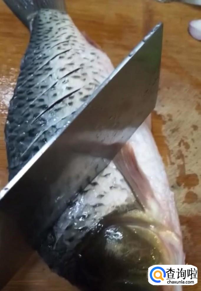 首先,我们将买来的鲤鱼处理干净,从背后切开,切开以后里面也剁两下(不要剁碎了)两面改刀方便入味