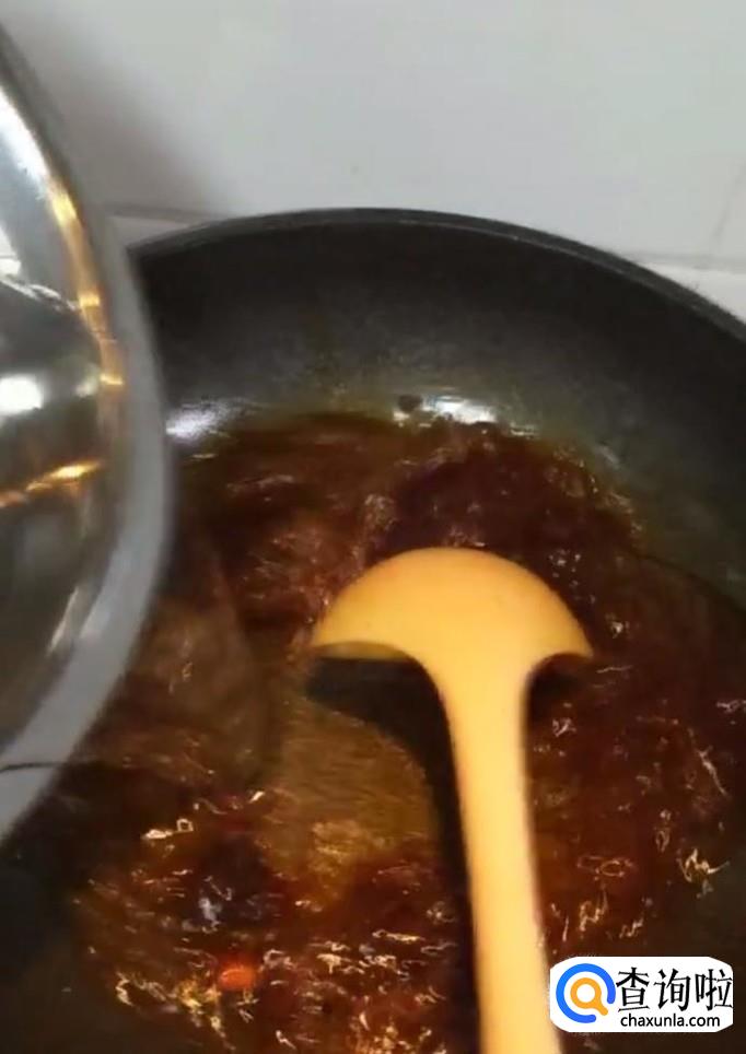 然后我们准备一口干净的锅,加少许油,油热以后放入豆瓣酱,麻辣料,把它炒香,加入适量的水,依据个人口味加入适量的盐,味精,鸡精,加入少许老抽,海鲜酱油,白糖,大火煮一下