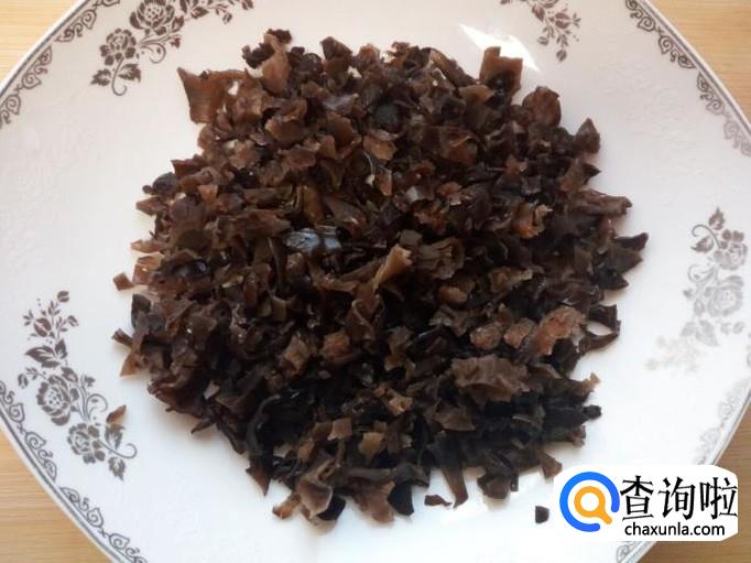 用温水快速泡发木耳。把泡发好的木耳用水清洗干净,攥干水分,切成末。