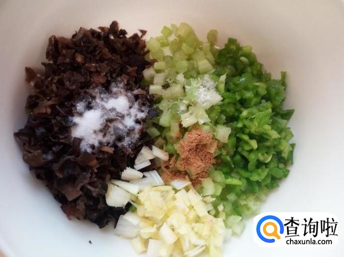 把切好的木耳,芹菜,青椒,葱,姜,一起放入碗中,放入盐,味精,五香粉。