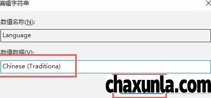 双击右侧窗口的]Language注册表,将数值数据内改为Chinese(Traditiona),点击确定即可。
