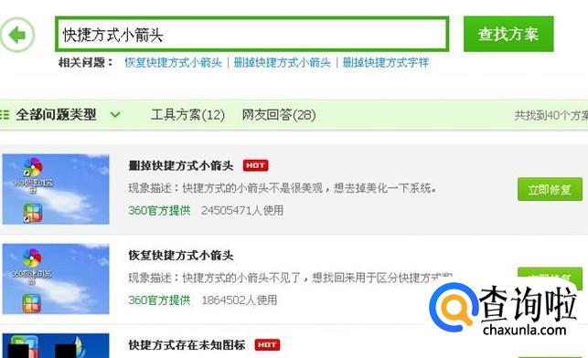 可以看到“删除快捷方式小箭头”选项,点击右边的“立即修复”,就会开始修复。