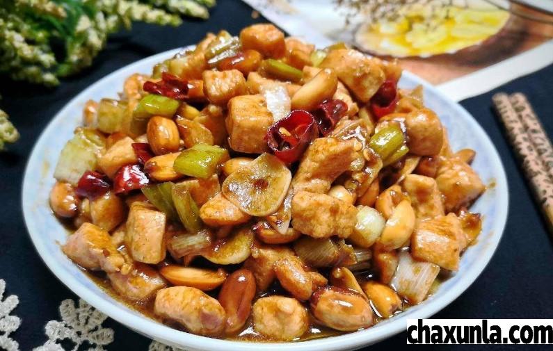 宫保鸡丁。国宝鸡丁是用鸡腿肉做的,整体吃起来是荔枝胡辣味,里面会加入鸡腿丁,大葱段花生米干辣椒等,全体起来是甜咸辣的味道,是在大多数地区都比较喜欢的下饭菜。