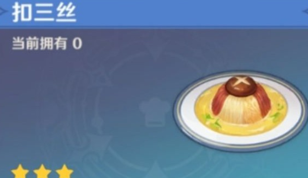 获得方式:完成烹饪扣三丝。火腿、禽肉、竹笋切成同样长短的细丝,旺火蒸熟后倒扣在汤盘中,淋上高汤。口感咸鲜,层次分明。简单来说就是碗底加一株元气满满的香菇,再放入火腿丝、竹笋丝与煮熟的鸡胸肉丝,并拼成碗型然后塞满内部,烹饪一番倒上本调好的鸡汤,其三者食材最为重要的一种便是冬笋啦,竹笋本就是神秘又偏僻的食材,所有爱者传承五花八门的厨艺也就是纪念家乡的味道。这样的一款人间美食俗称为扣三丝。食谱可在璃月港万民堂卯师傅菜店购买,售价5000。