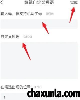 在自定义短语里面,点击右下角手动添加添加短语进去,右上角点击完成即可。