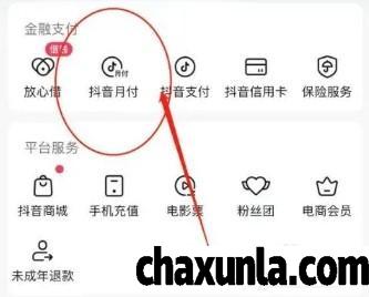 在弹出的界面之后点击抖音钱包界面在菜单当中找到抖音,月付点击进入。