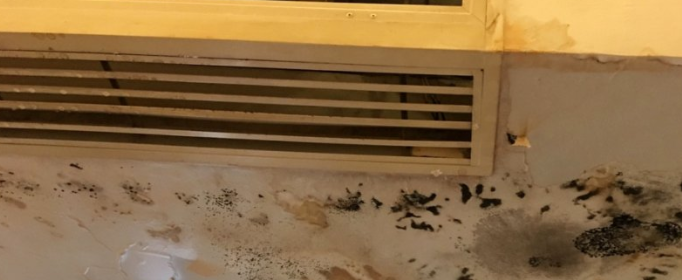 水槽破裂尽管没有造成排水问题,但是较低水位的时候水槽漏水,漏出的水下滴到风路上, 被吹出来就会喷水。