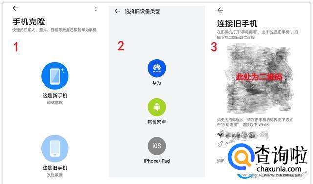 iPhone手机下载完成以后点击【这是新设备】之后根据提示点击【旧手机】可出现二维码。
