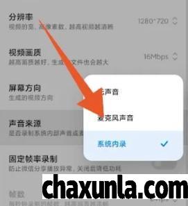 在新的页面当中找到声音来源,点击之后弹出小窗口,点击麦克风声音或者系统内录即可。