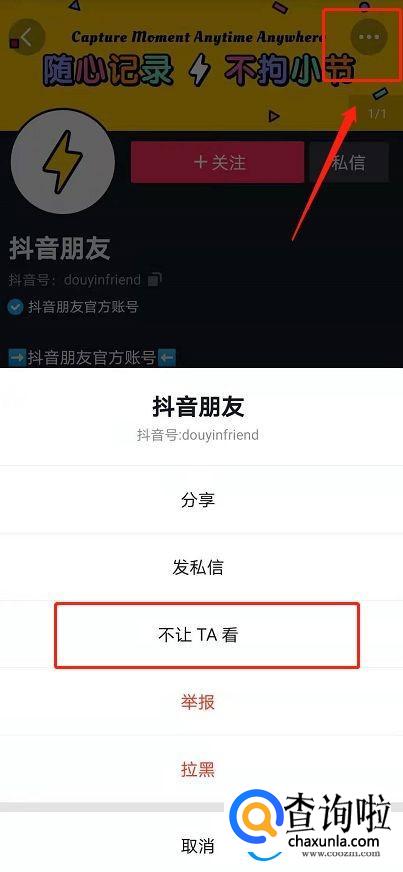 首先打开抖音软件并点击你要设置的好友,在界面之后点击右上方的【...】并点击【不让ta看】选项。