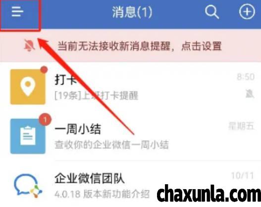 首先打开企业微信,点击左上角的三道横杠图标。
