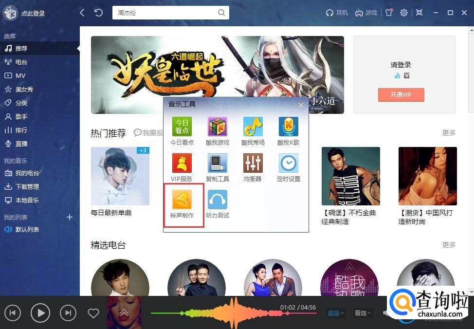 首先打开酷我音乐,在音乐菜单上右击或者单击设置选项,选音乐工具,选制作铃声。