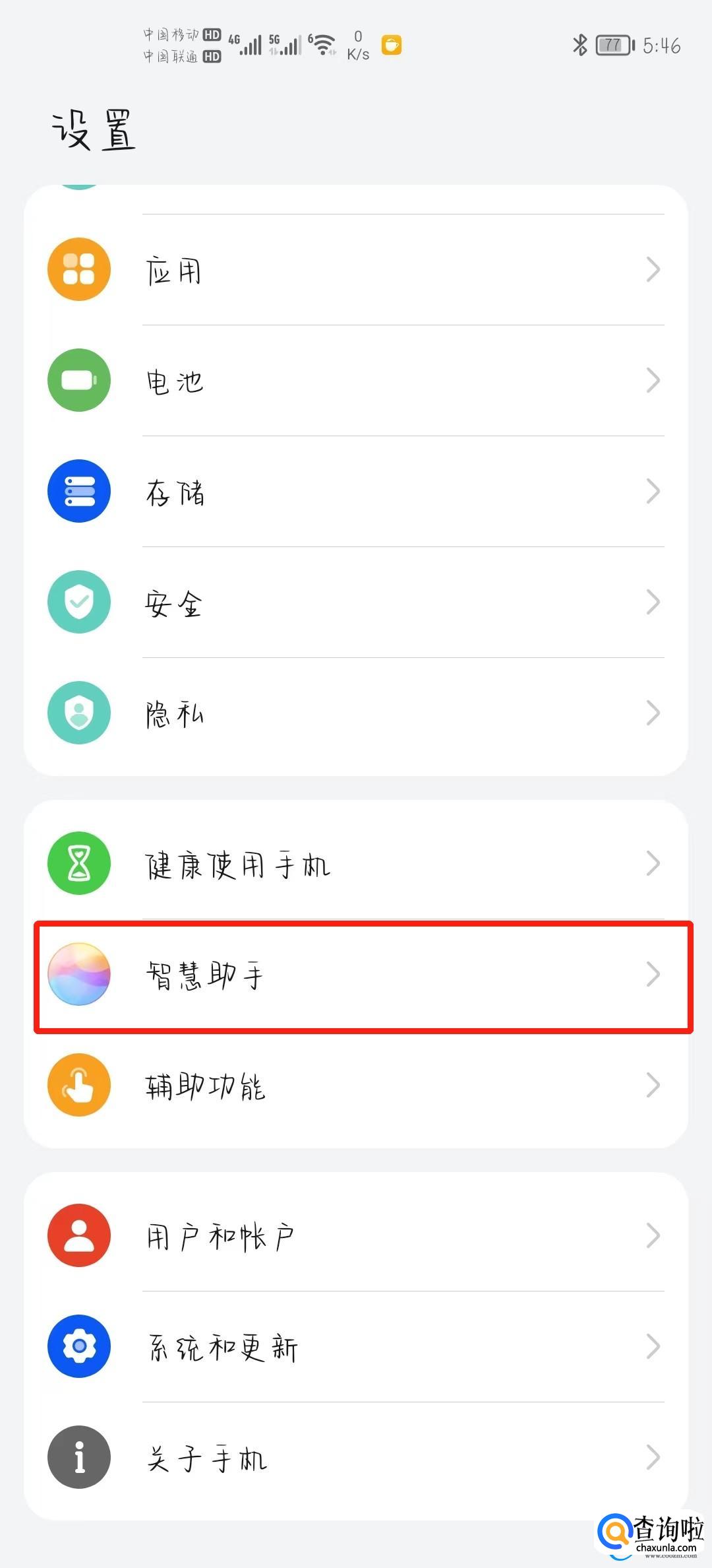 首先打开手机设置,找到【智慧助手】选项并打开即可。